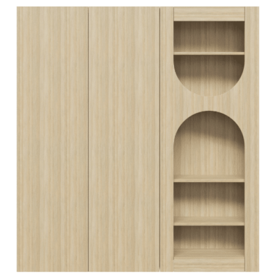 The Alumbra cupboards feature a sleek and functional design that seamlessly blends modern curves with traditional cupboard aesthetics, offering versatile usage as either wall-mounted storage or a standalone unit.